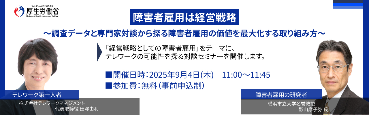 今回のセミナーは、障害者の就業意向やスキルに関する最新調査データをもとに、障害者雇用について経済学の視点から実践的な研究を行ってきた横浜市立大学・影山教授と、テレワークの第一人者である(株)テレワークマネジメント代表・田澤が、「経営戦略としての障害者雇用」をテーマに対談形式でお届けします。